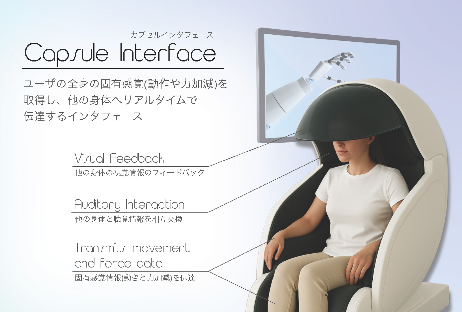 カプセルインタフェースは、筋変位センサ、スピーカー、ディスプレイがセットになったインタフェースです。カプセルインタフェースは様々な椅子やベッドに設置して使用します。ユーザは、座るか仰向けになり、手足を少し動かすことで、動作と力加減を他の身体(ロボットやアバター)に伝達します。同時に、他の身体と視聴覚情報を伝達します。