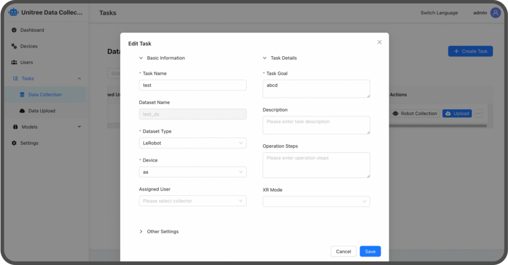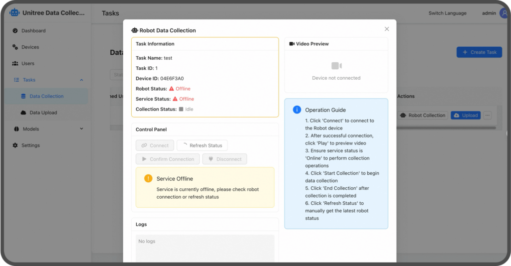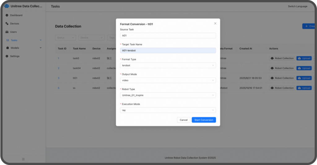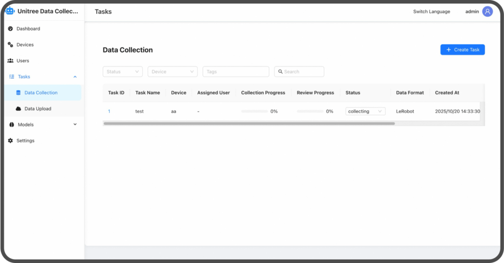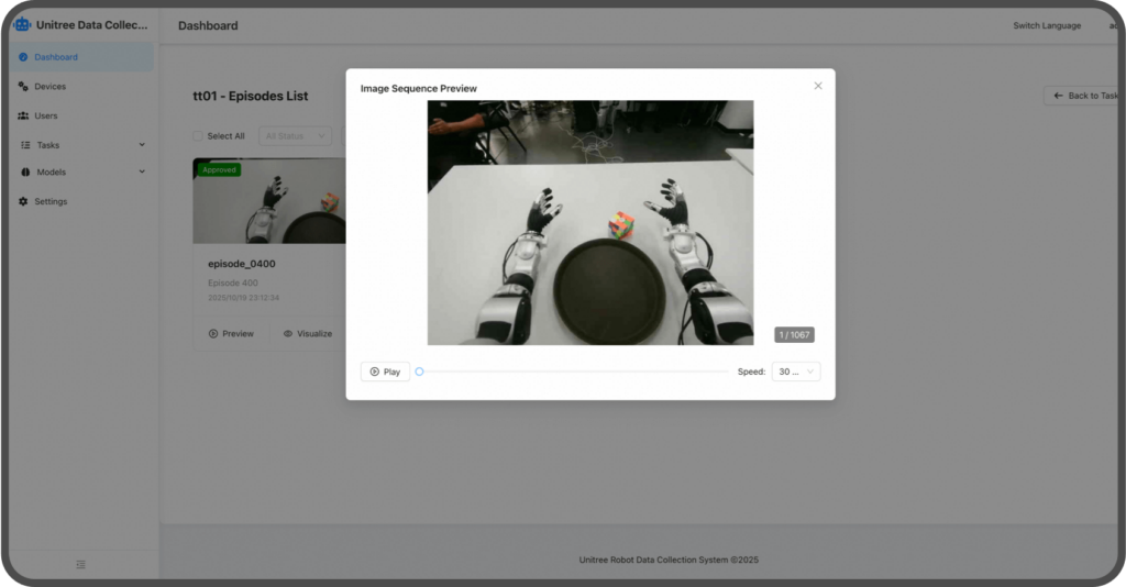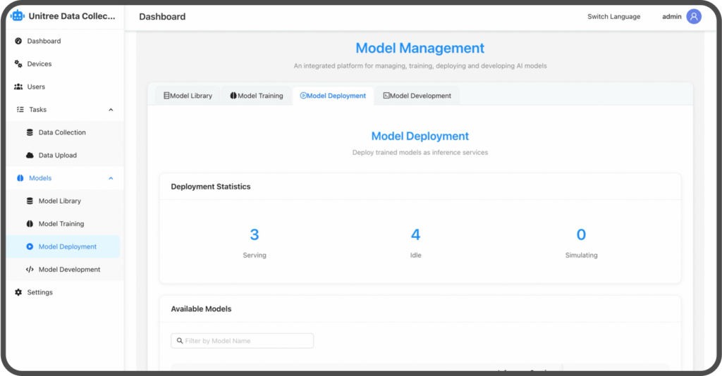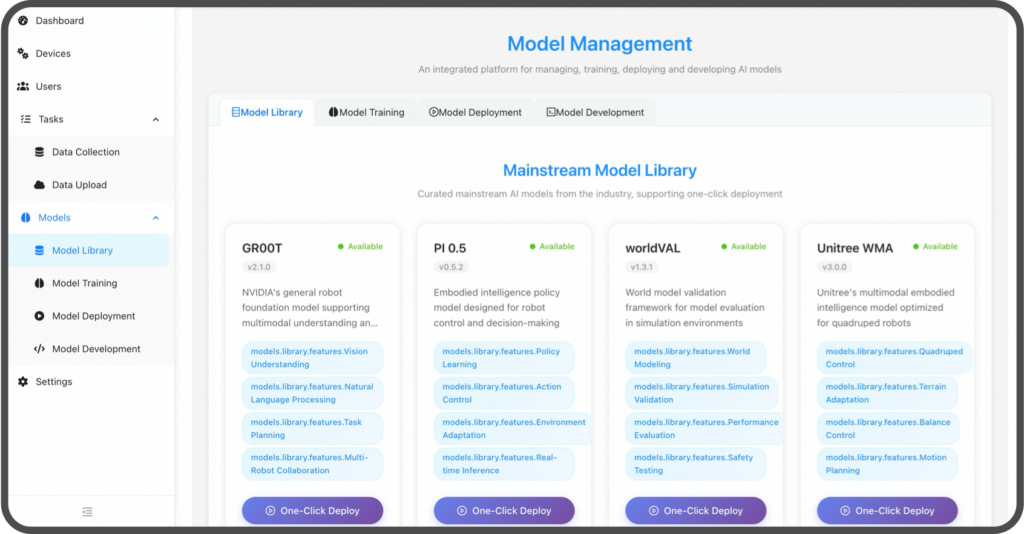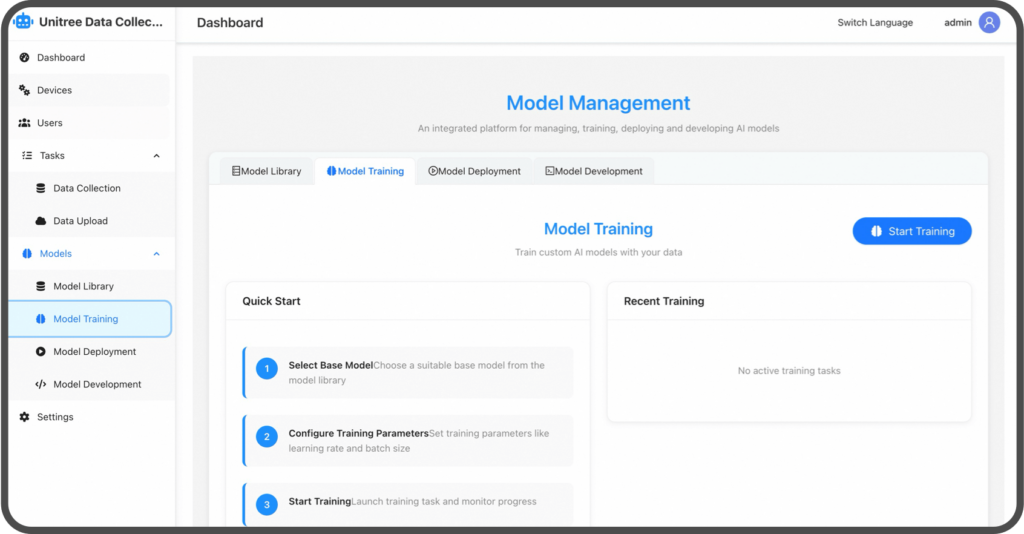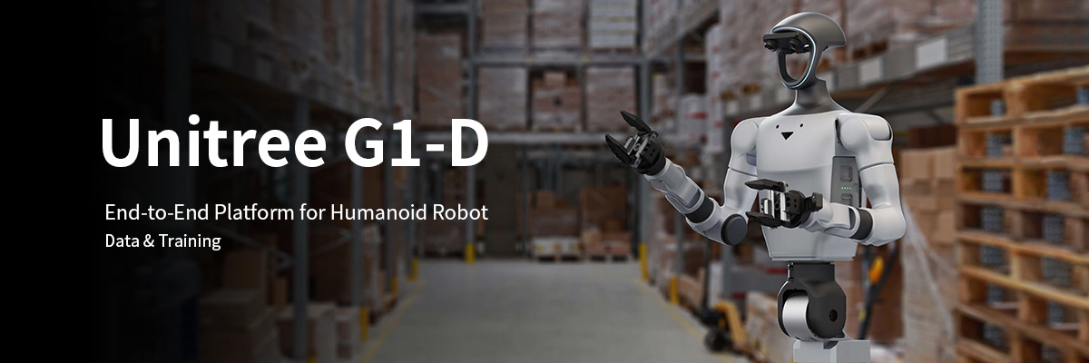 Unitree G1-Dは、ヒューマノイド型ロボットのための「エンドツーエンド・プラットフォーム」です。アクチュエーター、ギアボックス、エンコーダー、センサーなど多数の独自開発パーツを内蔵し、高性能なヒューマノイドロボット実現を支えます。さらに、データ取得→処理→アノテーション→モデル学習→推論という一連の流れを統合したプラットフォームを備え、あらゆる開発フェーズをスムーズに進められる設計です。